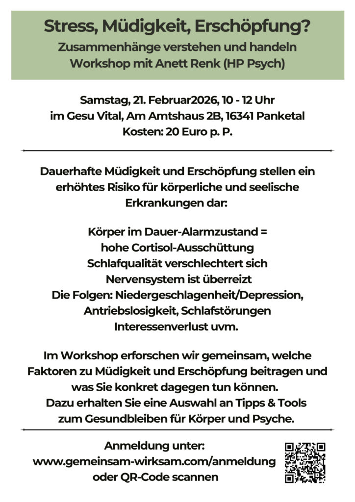 « Alle Veranstaltungen Stress, Müdigkeit, Erschöpfung? Zusammenhänge verstehen und handeln! 21. Februar ab 10:00 Uhr bis 12:00 Uhr €20 « Gesundheitsvortrag: Diabetisches Bein / Fuß Gesundheitsvortrag: Durchblutungsstörungen » Zum Kalender hinzufügen Google Kalender iCalendar Outlook 365 Outlook Live Details Datum: 21. Februar Zeit: 10:00 Uhr bis 12:00 Uhr Eintritt: €20 Veranstaltungsort Gesu Vital Am Amtshaus 2b Panketal, 16341 Google Karte anzeigen