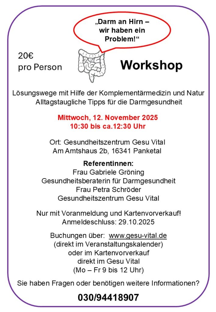 « Alle Veranstaltungen Workshop: Darmgesundheit 12. November ab 10:30 Uhr bis 12:30 Uhr Mit Anmeldeformular! « Gesundheitsvortrag: Durchblutungsstörungen Workshop: Klangreise » Anmeldeformular: Ihre Angaben:* FrauHerr Anmeldung für Veranstaltung:* Workshop: Darmgesundheit (12.11.2025; 10:30Uhr) Anzahl der Teilnehmer:* Ihre Nachricht: Bitte beweise, dass du kein Spambot bist und wähle das Symbol Schlüssel. Zum Kalender hinzufügen Google Kalender iCalendar Outlook 365 Outlook Live Details Datum: 12. November Zeit: 10:30 Uhr bis 12:30 Uhr Eintritt: Mit Anmeldeformular! Veranstaltungsort Gesu Vital Am Amtshaus 2b Panketal, 16341 Google Karte anzeigen